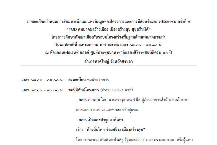 กำหนดการสัมมนาเพื่อเผยแพร่ข้อมูลของโครงการและการมีส่วนร่วมของประชาชน ครั้งที่ 5 “TOD คมนาคมสร้างเมือง เมืองสร้างสุข สุขสร้างได้”